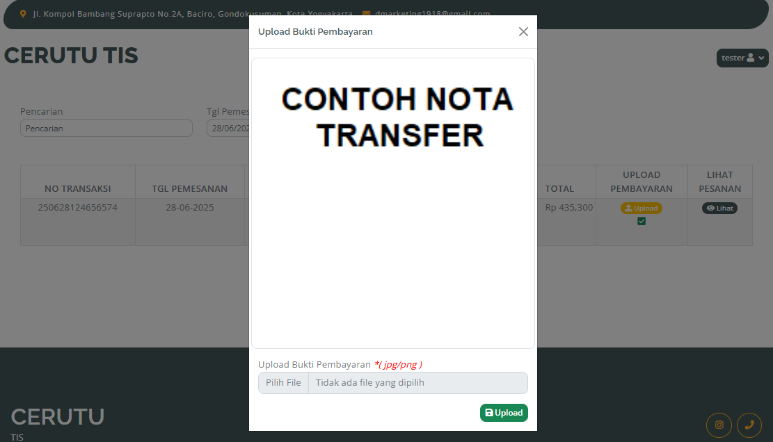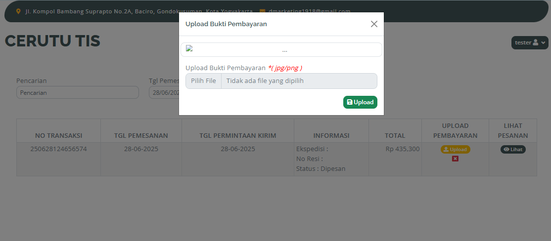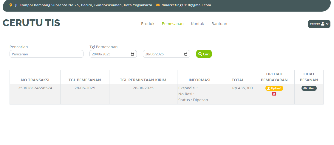 10. Kemudian anda akan diarahkan langsung ke halaman pemesanan. Dihalaman pemesanan, anda dapat melakukan pengecekan pesanan yang sudah anda pesan, baik itu pesanan lalu atau hari ini. Dengan cara mengubah tanggal kemudian klik cari. Jika anda sudah melakukan pembayaran, silakan untuk upload bukti pembayaran pada kolom upload pembayaran. Anda Juga dapat melihat produk-produk yang telah anda pesan pada bagian lihat pesanan.