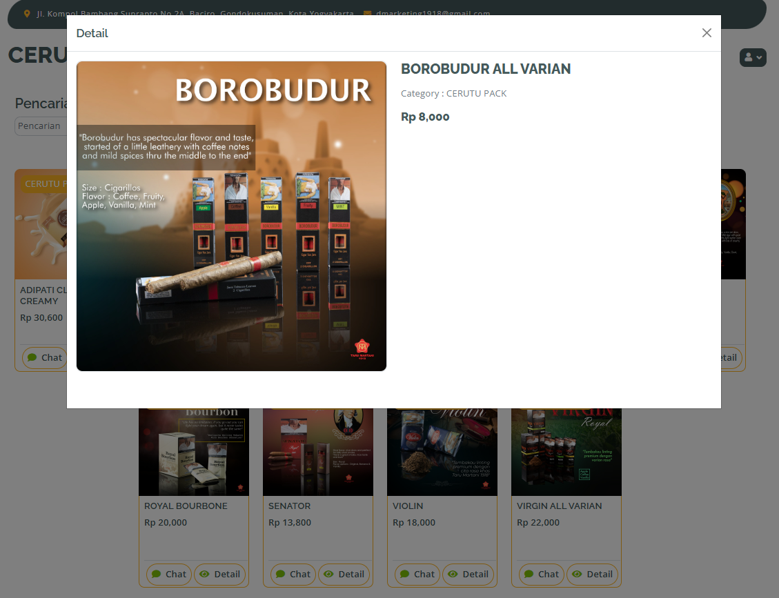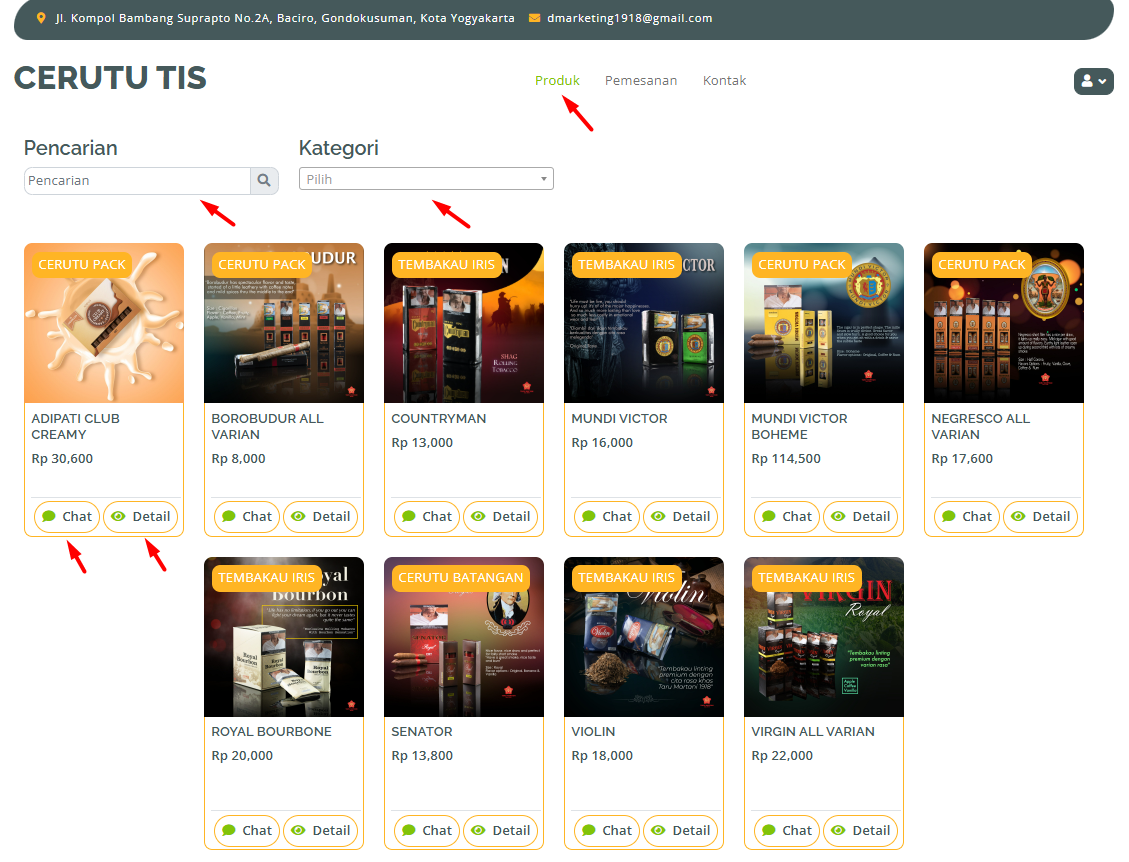1. Pada halaman produk menampilkan produk-produk yang dijual beserta dengan harga, anda dapat melakukan pencarian produk pada bagian kategori produk atau dipencarian produk. anda dapat melihat detail produk pada bagian detail, dan dapat menghubungi customer service pada bagian chat seperti gambar dibawah ini.
