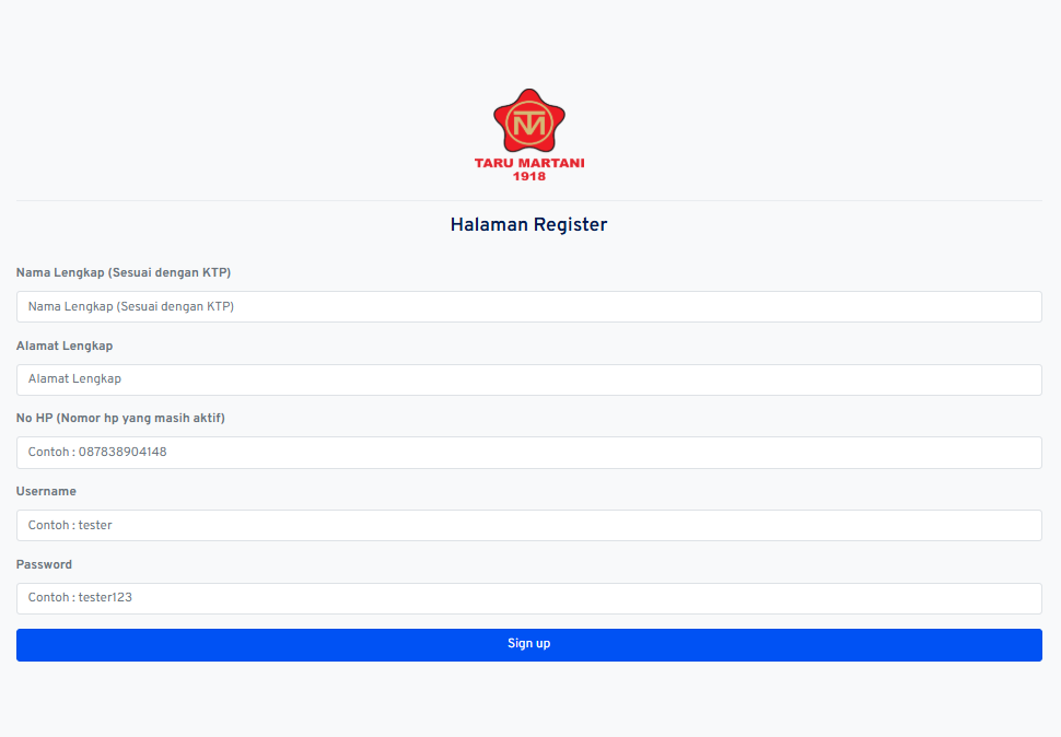 7. Pada halaman login, silakan untuk melengkapi data-data yang ada di form register seperti gambar dibawah ini. Jika sudah mengisi data-data yang diminta silakan untuk melakukan klik pada tombol Sign Up, dan melakukan login menggunakan andaname dan password.