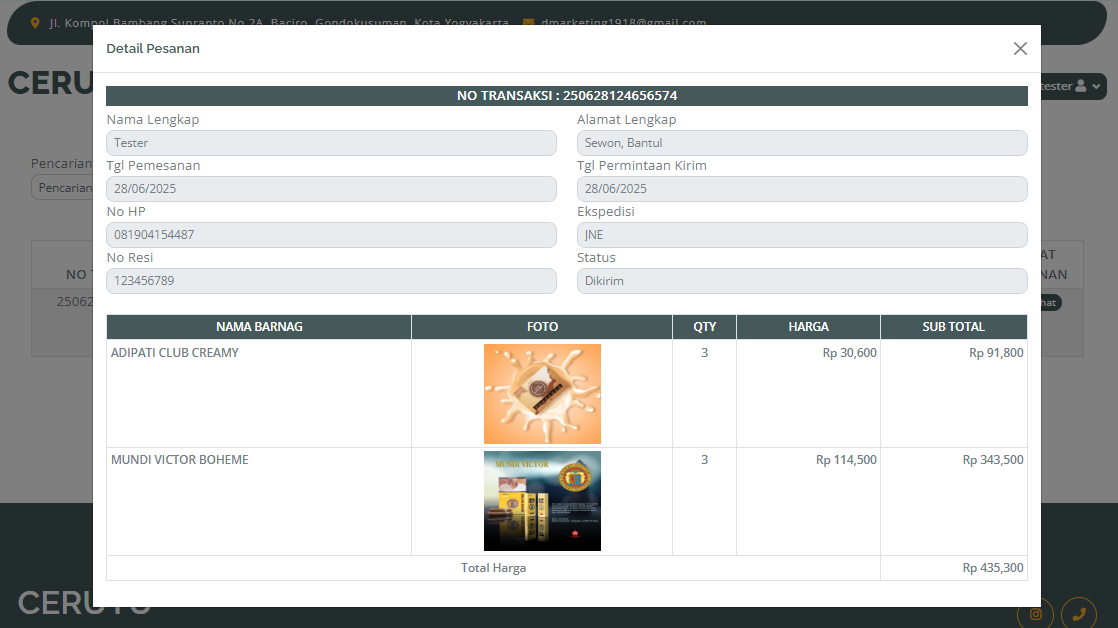 13. Barikut ini adalah detail pesanan anda. Untuk melihat detail pesanan, anda dapat melihat pada kolom lihat pesanan, kemudian klik pada tombol lihat, dan akan muncul seperti gambar dibawah ini.