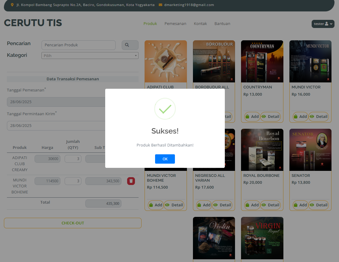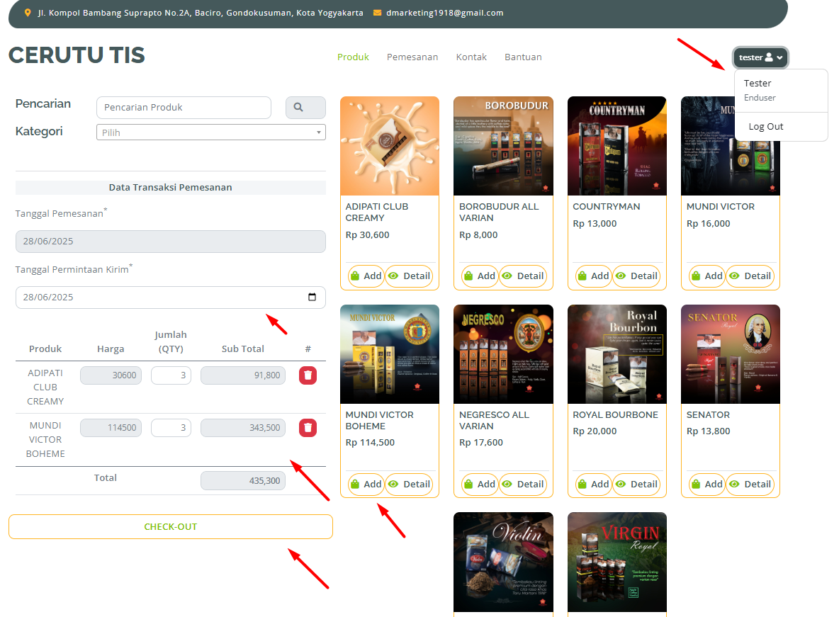 8. Setelah berhasil melakukan login, maka anda akan mendapatkan tampilan halaman produk seperti gambar dibawah ini. Pada bagian kanan atas akan terdapat username anda yang berhasil melakukan Login. Kemudian untuk menambahkan pesanan anda dapat melakukan klik pada tombol Add, lalu produk yang telah anda klik akan otomatis bertambah didalam data transaksi pemesanan seperti gambar dibawah ini. Kemudian anda juga dapat mengatur untuk tanggal permntaan kirim dan jumlah produk yang anda inginkan. Setelah itu jika anda sudah mengatur produk dan tanggal, anda dapat melakukan klik tombol check-out seperti gambar dibawah ini.