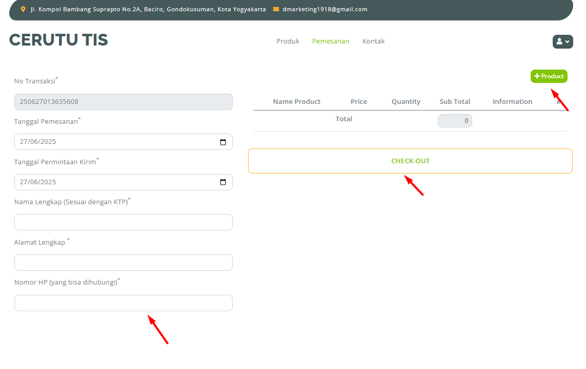 4. Pada halaman pemesan terdapat form pengisian data diri jika ingin melakukan pemesanan, dan tombol (+ produk) untuk menambahkan produk yang akan dipesan, kemudian untuk tombol check-out digunakan untuk menyimpan produk yang telah dipilih dan dipesan, seperti gambar dibawah ini.