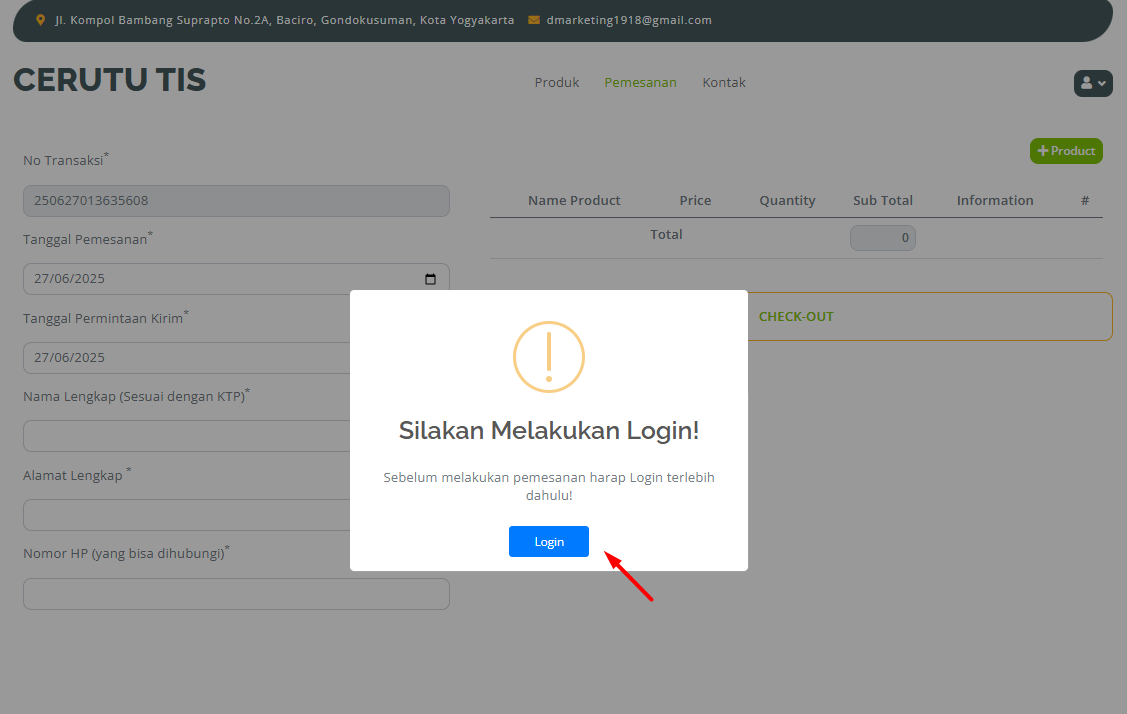 5. Setelah anda melakukan atau klik tombol check-out akan muncul notifikasi silakan melakukan login, kemudian anda diminta untuk melakukan login terlebih dahulu sebelum melakukan pemesanan produk, seperti gambar dibawah ini.